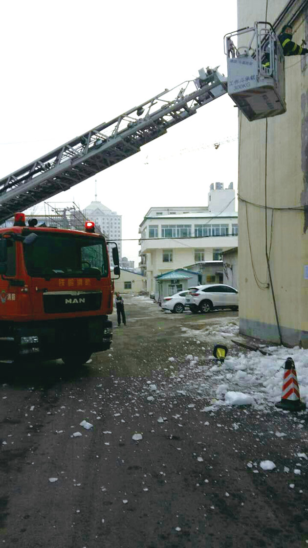 2016年12月21日恰逢冬至到来之时,为了排除隐患,杜绝安全事故发生,我院消防部门的工作人员在院领导的指挥下对全院楼顶的冰溜子进行统一清理。在巡查到骨科一病房楼外时发现四楼东房山一处相当大的冰溜子危险性极高。工作人员立即动用消防钩枪、消防斧对其进行清除,但都因其位置太高无法清理彻底,在这涉及到人身安全和极易造成财产损失的紧要关头,工作人员第一时间想到了消防部门,是否可以求助他们来解决这一难题,于是抱着试试看的态度拨打了119求助电话,消防部门了解情况后立即派遣三名消防战士及一辆带有云梯的消防车,火速赶到医院,在工作人员的带领下来到现场,迅速将冰溜子彻底清理干净,为我们排除了安全隐患。在此提醒大家,出行时尽量不要靠近楼体,注意头顶上的冰溜子,警惕高空坠物。
