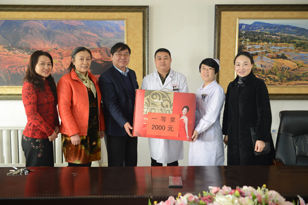 2月9日上午,在机关四楼会议室,党委副书记党占涛、工会主席丁力代表院党委向袁宇飞、付岩夫妇颁发了奖品。希望袁宇飞一家在新的一年里珍惜荣誉、再接再厉。并号召全院职工学习他们爱院爱家、孝敬长辈、尊老爱幼、向上向善的家庭文明新风尚;学习他们爱岗敬业、无私奉献、努力专研的奋发精神;学习他们舍小家爱大家,以大局为重,以事业为重的集体主义观念,把医院建设成文明幸福的大家庭,为构建和谐医院多做贡献!
