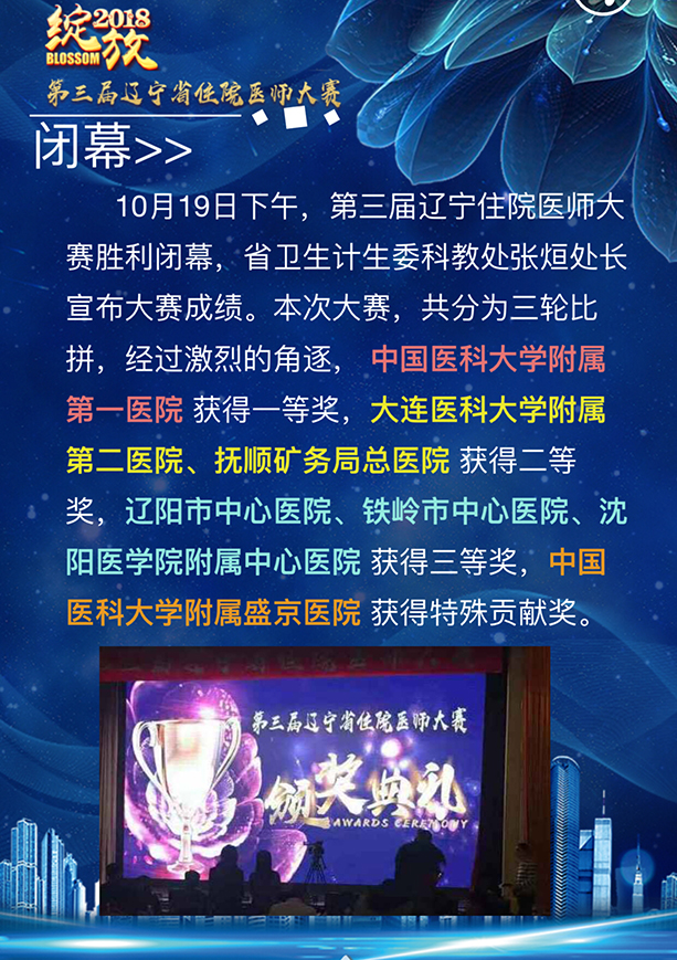 由辽宁省卫生计生委、辽宁省医师协会主办,中国医科大学附属盛京医院承办的2018第三届辽宁省住院医师大赛,于10月18、19日在中国医科大学附属盛京医院举行。来自省内25家规培基地的100名住院医师参加了本次大赛,我院三年级住院医师杜可新、高智、刘思彤、刘莹作为参赛队员参加了比赛。本次大赛分为预赛第一轮(每队必答)、预赛第二轮(两队抢答)、决赛(标准化病人问诊、查体、辅检选择及判读、诊断)三个阶段,我院代表队预赛表现出色,顺利进入决赛,并在决赛中以第五名的成绩获得大赛三等奖。