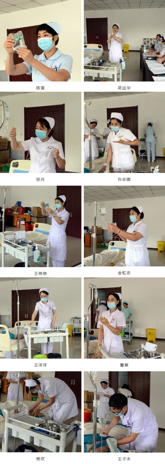 通过两轮比赛选拔,前十名的选手分别为:感染内科病房护士长陈雪、消化内科护士吴运华、眼科病房护士张月、综合内科病房(重症)护士孙志娜、心血管内科病房护士王琳琳、呼吸与危重症医学科护士金虹志、神经内科二病房护士王洋洋、重症医学科病房护士董爽、耳鼻喉科病房护士杨欢、导管室护士王子未。