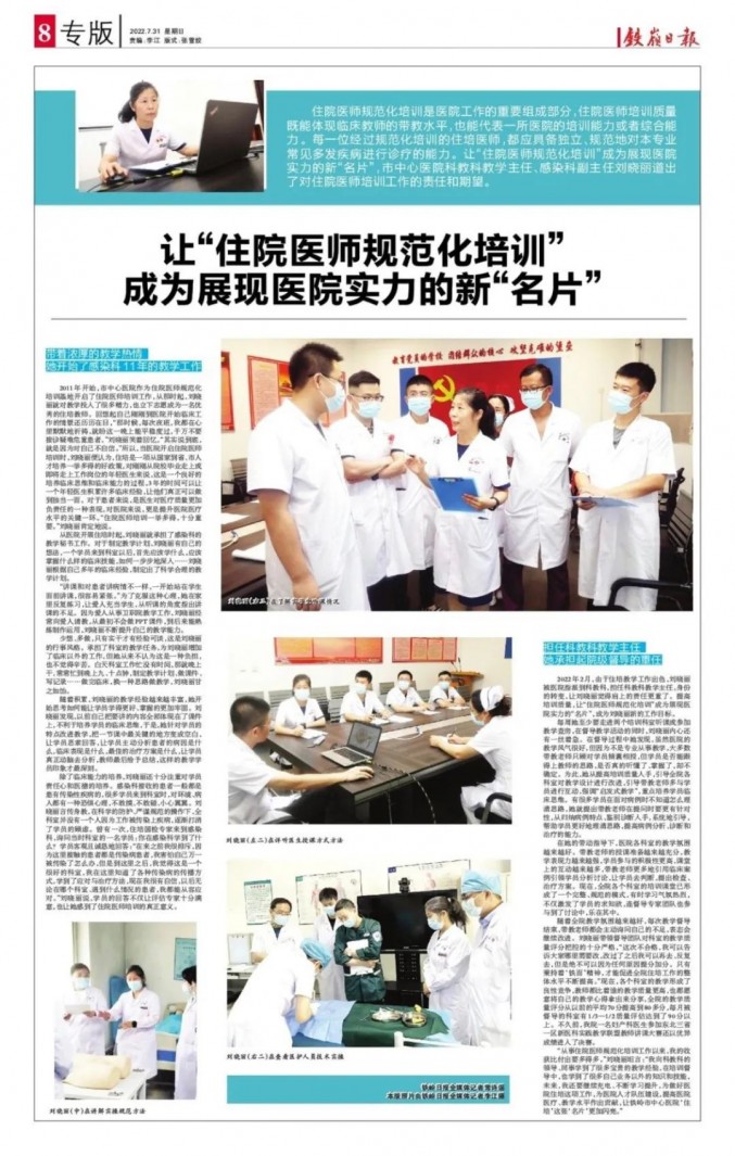 住院医师规范化培训是医院工作的重要组成部分,住院医师培训质量既能体现临床教师的带教水平,也能代表一所医院的培训能力或者综合能力。每一位经过规范化培训的住培医师,都应具备独立、规范地对本专业常见多发疾病进行诊疗的能力。让“住院医师规范化培训”成为展现医院实力的新“名片”,市中心医院科教科教学主任、感染科副主任刘晓丽道出了对住院医师培训工作的责任和期望。