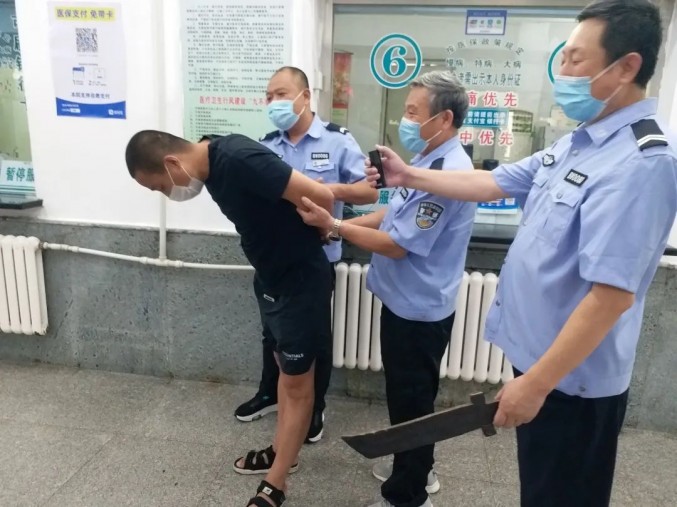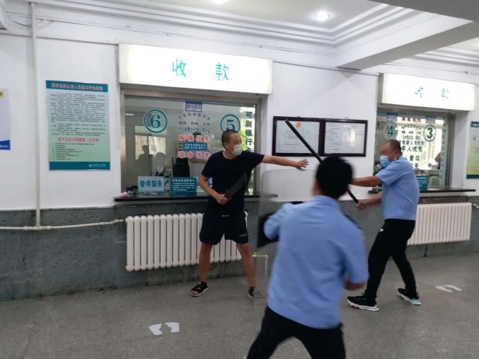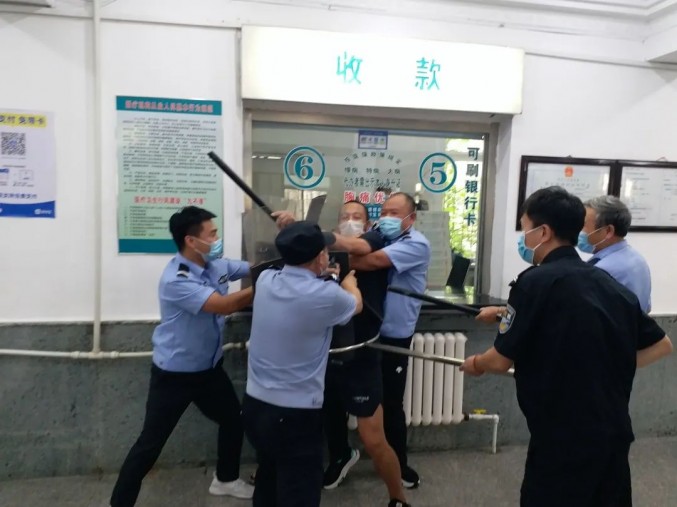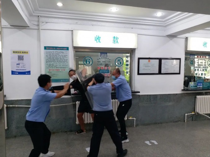 按照上级有关要求,为切实加强我院安保防范和处置突发事件的能力,7月25日下午,我院组织开展了反恐突发事件现场演练。14时40分28秒,保卫科值班室一键报警器不停闪烁,收款处报警有人持刀行凶。值班人员立即组织安保人员迅速赶往现场,同时拨打110报警电话并报告上级领导。现场发现有一男子手持管制刀具正准备对收款人员进行人身伤害,情况危急,安保人员手持反恐器械成功将男子制服。我院反恐治安应急领导小组副组长王雷副院长现场指导保卫科将其移交公安机关并积极配合公安机关进行调查取证。反恐防范工作不能有丝毫的麻痹思想和侥幸心理,通过反恐演练,我院安保队伍增强了处置突发事件的能力,切实担负起守护医院平安、确保一方稳定的职责任务。