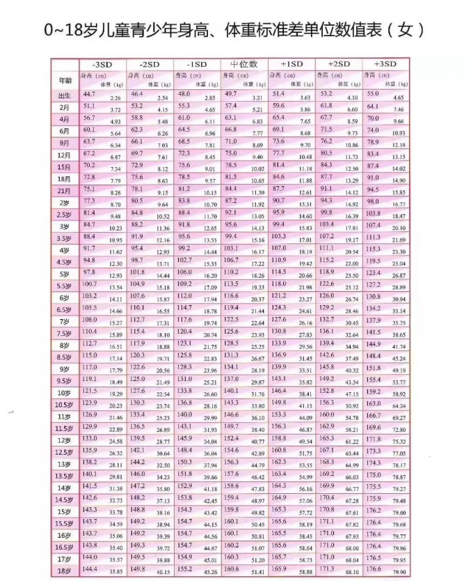 家长可参考下表对照(粉色女孩,蓝色男孩),看看孩子的身高发育是否“输”在了起跑线上。如果家长发现自己的孩子是班级里同性别孩子中个子最矮的,或每年生长速度少于5厘米时,应考虑孩子可能存在生长障碍。