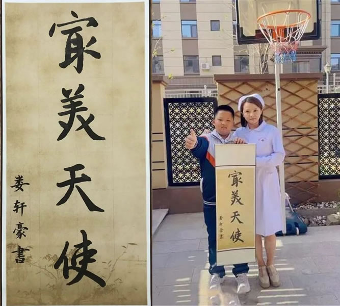 岳丹丹是神经内科一病房护士,儿子小豪今年10岁,是个不折不扣的小暖男。性格沉稳的他已经练了二年书法。这一次他一气呵成“最美天使”四个字,书写出他眼里中的最美护士妈妈。