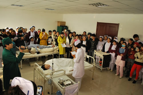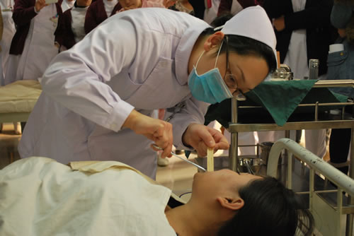 1月23日下午,护理部组织全院护士长和示教员在护理示教室进行了包括卧床病人更换床单法、病人由床上移至平车法、口腔护理、皮内注射、留置导尿、膀胱冲洗、静脉输液、双腔鼻导管吸氧法、单人徒手心肺复苏、鼻饲法等在内的十项护理技能示教。本次示教员护理部特别邀请了 “首届市长杯”护理技能大赛的5名选手和4名表现优秀的临床年轻护士担任,示教期间选手们规范、优美的动作,亲切、生动的沟通语言给在场的护士长、护士们留下了深刻印象,更引起了一阵阵热烈的掌声,护理部希望通过本次竞赛选手的精彩示教,能够更加规范我院的护理技能操作,同时此次操作不同以往均采用真人对象,使护患双方沟通更加真实。