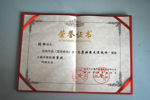 2013年1月 28日,在铁岭市摄影家协会和沈阳今日康华摄影有限公司联合主办的《尼康映像走近铁岭》摄影大赛中,我院惠民分院院长张羽的摄影作品《雪原疾风》在数千幅参赛作品中脱颖而出荣获特等奖,图为工作人员为其颁发奖杯和最高大奖尼康相机。