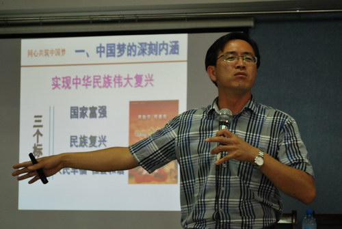 曹立清老师以“同心共筑中国梦”为主题,从四个方面解读了习近平总书记“中国梦”的内涵和未来的前进方向。这四个方面是: