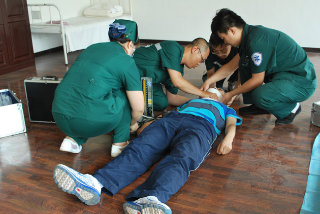 急诊科在多次进行应急预案演练后,于7月19日有幸请到卫生局应急办主任徐浩莅临指导,本次演练是根据大型运动会的运动损伤专业性、人群聚集性等特点而设计,内容包括120急救中心的指挥调度系统、调度员接警程序及应急、语言表述能力;各急救站、急救车、人员、服装、药品、器械配备、通讯系统、出车反应速度、车载状态操作、应急反应速度;成人基础生命支持和小腿外伤(疑似胫骨骨折)的止血、包扎、固定、搬运现场急救技术操作,共12名医疗急救人员参加演练。