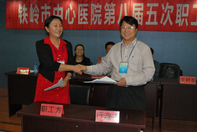 随后,与会代表分内科和医务分会、外科和五妇儿分会、门诊、机关和分院分会、辅助和后勤分会四组进行了讨论,大家结合医院实际畅所欲言,各抒己见。经过认真地讨论和审议,大会通过举手表决方式,一致通过了医院相关合同及方案,圆满地完成了各项议程。院长李树普代表医院行政方与工会主席丁力代表职工方签订《意大利贵宾会会员中心集体合同》和《女职工特殊权益保护专项集体合同》。