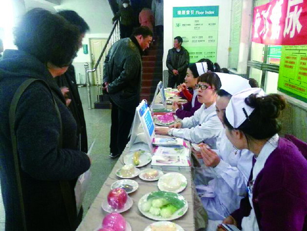 作为糖尿病治疗的专科病房,我院内分泌科希望珍惜从点滴做起,为“糖友”们贡献绵薄之力。在院领导及相关部门的支持下,今年糖尿病日活动地点安排在我院门诊大厅一楼,为了不影响门诊部的正常工作,在门诊没有开诊前,可爱而不辞辛苦的护士姐妹们在主任指导及护士长带领下就开始布置会场,立好精心准备的宣传板报,放好糖尿病宣教手册,摆好食物讲解模型。