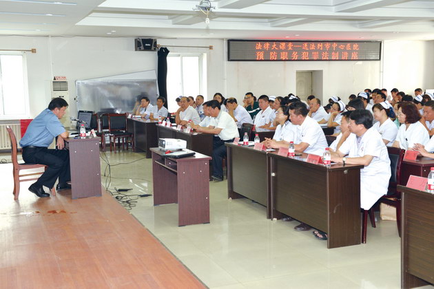 9月2日,铁岭市银州区检察院预防科科长佟国柱来到我院,为医护人员上了一堂精彩的预防职务犯罪法制专题讲座。区检察院检察长王洪彬、市检察院预防处处长马莹、市检察院政治处副处长纪小平、市检察院宣教处处长李学军及我院领导班子成员参加并听取了本次讲座。