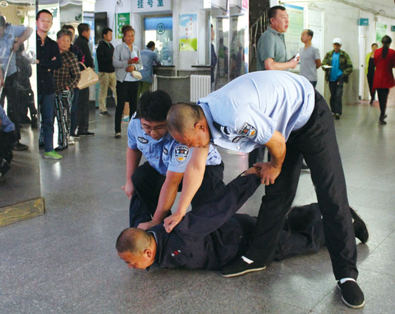 为贯彻落实省卫计委和市反恐办反恐工作要求,提高广大医务工作者知恐、识恐、防恐意识,提高医院应对恐怖事件的处置能力,维护医院的和谐稳定,8月27日上午,医院保卫处在院内发放由公安部和辽宁省反恐领导小组办公室分别制定的《公民安全防范手册》和《公民防范恐怖袭击手册》。同时,为检验医院“反恐应急”能力和应对“突发公共事件”的实战能力,在保卫科长刘华伟的指挥下,在门诊大厅进行了反恐模拟演练。