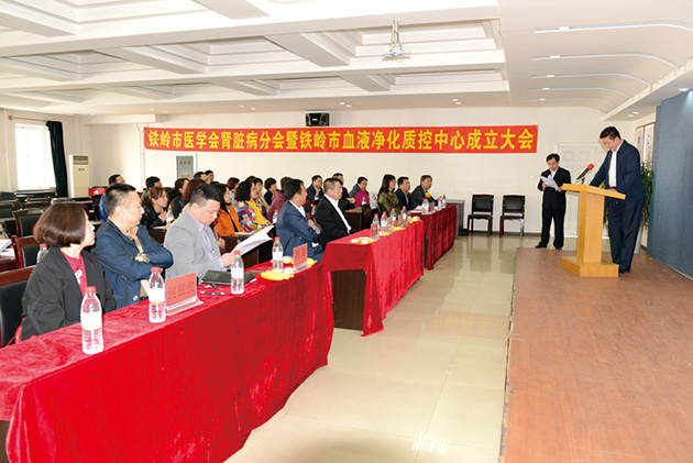 2016年4月9日,首届铁岭市医学会肾脏病分会暨铁岭市血液净化质控中心成立大会,在我院学术报告厅召开。铁岭市医学会秘书长时耀星,我院副院长贺佳辉、王长军,市卫计委医政科时辰、医学会王泽及来自县、市、区医院肾内科及血液净化领域的30多位专家和学者出席了会议。时耀星秘书长、贺佳辉副院长分别致贺词并讲话,祝贺铁岭市医学会肾脏病分会暨铁岭市血液净化质控中心正式成立。